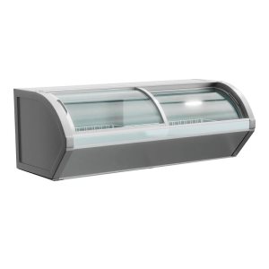 • Раздвижные двери с изогнутым стеклом: Двери выполнены из закаленного теплоотражающего стекла. Специальное покрытие стекла способствует экономии энергии, минимизируя теплопотери. Изогнутая форма стекла не только улучшает эстетику, но и облегчает доступ к продуктам.