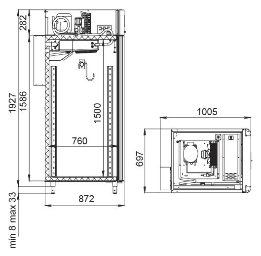 Каталог оборудования Холодильное оборудованиеШкафы холодильныеСпециализированные холодильные шкафыШкаф холодильный для вызревания мяса Polair CS107 Meat (Тип 2) Шкаф холодильный для вызревания мяса Polair CS107 Meat (Тип 2) Код товара: 009-395 Поделиться: WhatsAppTelegram СравнитьДобавить в КПВ избранное 0 391 000 ₽ В корзину 0 шт Под заказСамовывоз сегодня бесплатно Взять в кредит Купить в лизинг Получить консультацию в WhatsApp Описание Характеристики Отзывы 0 Инструкции 5 Шкаф холодильный для вызревания мяса Polair CS107 Meat (Тип 2) разработан для создания идеальных условий хранения и дозревания мяса на предприятиях общественного питания и торговли. Монолитный цельнозаливной корпус выполнен из нержавеющей стали как снаружи, так и внутри (за исключением задней стенки), что обеспечивает высокую прочность конструкции, долгий срок службы и удобство санитарной обработки. Оборудование стабильно работает при температуре окружающей среды до +40 °С. Особенности: Верхнее расположение агрегата, обеспечивающее свободный доступ и равномерное распределение холода Многофункциональная русифицированная панель управления с цветным дисплеем диагональю 5" Возможность программирования и сохранения пользовательских режимов 4 перфорированные полки из нержавеющей стали (максимальная нагрузка на каждую — 40 кг), обеспечивающие удобное размещение мясных заготовок Встроенный ультразвуковой увлажнитель (требуется подключение к системе подачи очищенной воды и канализации) UV-лампа для обеззараживания воздуха, предотвращающая развитие нежелательной микрофлоры Распашная дверь с заливной теплоизоляцией, встроенной ручкой и сменным магнитным уплотнителем Отключаемая LED-подсветка внутри камеры, улучшающая обзор продукции Замок для дополнительной безопасности Педаль для удобного открытия двери без помощи рук Штампованное углубление в дне корпуса для облегчения мойки и ухода Регулируемая влажность: от 60 до 95 % Толщина стенки корпуса: 43 мм Polair CS107 Meat (Тип 2) — это профессиональное оборудование для безопасного и качественного хранения и дозревания мяса. Благодаря продуманной конструкции, функционалу контроля климата и дополнительным системам (увлажнителю, UV-лампе, программируемым режимам), шкаф помогает сохранить структуру, вкус и свежесть мясной продукции, повышая общий уровень производства и хранения на предприятии.Изображение товара, представленного на фото, может отличаться от его фактического вида. Показать все Габаритные размеры697×1005×1960 ммДиапазон рабочей температурыот -2 до +30 °CОбъём700 лТип двериМеталлическая Количество полок4 перфорированные полки из стали с п/покрытием штУровень влажностиот 60 до 95 %Комплектацияштанга + 2 перфорированные полки из нерж стали Тип оттайкиавтоматический с системой испарения конденсата Тип охлаждениядинамический с мягким обдувом без заветривания UV-лампаДа ХладагентR134a Вес нетто130 кгБрендPolair Оставить отзыв Еще никто не оставил отзыв на этот товар Схема POLAIR CS107-Meat.jpgИнструкция на POLAIR CS107-Meat.pdfБрошюра на POLAIR CS107-Meat.pdfДекларация о соответствии.pdfСертификат соответствия.pdf Похожие товары Перейти в каталог Под заказ 390 915 ₽ Шкаф холодильный для вызревания салями Polair CS107 Salami В наличии 403 670 ₽ Шкаф холодильный для хлебопекарных производств Polair CS107 Bakery Br (Тип 2) С этим товаром покупают Под заказ 132 400 ₽ Конвекционная печь Abat КЭП-4Э Ранее просмотрен