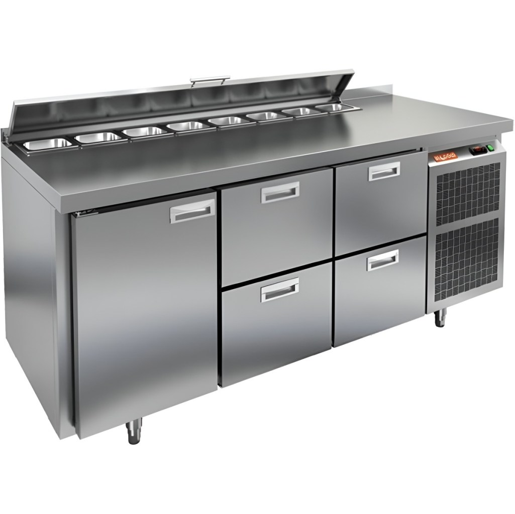 Такая конструкция позволяет повару работать быстрее и эффективнее, так как все необходимые продукты находятся под рукой. Корпус и столешница выполнены из прочной нержавеющей стали, устойчивой к коррозии и легко поддающейся санитарной обработке. Металлическая крышка защищает продукты от загрязнений и сохраняет их свежесть.