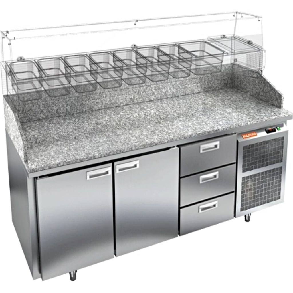 Каталог оборудования Холодильное оборудованиеСтолы охлаждаемыеСтолы холодильные для пиццыСтол холодильный для пиццы HiCold PZ3-113/GN камень Стол холодильный для пиццы HiCold PZ3-113/GN камень Код товара: 065-007 Поделиться: WhatsAppTelegram СравнитьДобавить в КПВ избранное 0 312 652 ₽ В корзину 0 шт Под заказСамовывоз сегодня бесплатно Взять в кредит Купить в лизинг Получить консультацию в WhatsApp Описание Характеристики Отзывы 0 Стол холодильный для пиццы HiCold PZE3-113/GN камень предназначен для использования в пиццериях, кафе, магазинах и ресторанах. Он идеально подходит для раскатки теста, подготовки ингредиентов и кратковременного хранения скоропортящихся продуктов. Витрина приобретается отдельно. Стол сочетает корпус из нержавеющей стали и гранитную столешницу, которая устойчива к механическим и температурным нагрузкам и удобна в работе с тестом. Такая конструкция обеспечивает долговечность, гигиеничность и простоту ухода. Особенности модели: Охлаждение: динамическое — равномерное поддержание температуры Оттайка: автоматическая — удобство и экономия времени Панель управления: электронная — точная настройка температуры Ножки: регулируемые по высоте — устойчивость на неровной поверхности Двери: 2 глухие двери с автоматическими доводчиками и фиксатором открытого положения Ящики: 3 выдвижных ящика — удобное хранение ингредиентов Уплотнители: легкозаменяемые магнитные — герметичность и простота обслуживания Толщина теплоизоляции: 50 мм — сохранение холода и энергоэффективность Рабочая поверхность: глубина 680 мм — удобство работы HiCold PZE3-113/GN камень— это надёжный и функциональный холодильный стол для пиццы, который сочетает прочность, эргономику и эффективное охлаждение. Благодаря гранитной столешнице, корпусу из нержавеющей стали, двум глухим дверям и двум выдвижным ящикам он станет универсальным решением для профессиональной кухни. Изображение товара, представленного на фото, может отличаться от его фактического вида. Показать все Габаритные размеры1835×700×1050 ммДиапазон рабочей температурыот +2 до +10 °CРасположение агрегатаБоковое Материал столешницыГранитная Тип столаС дверьми и ящиками Тип двериГлухая Объём505 лКоличество дверей2 штКоличество ящиков3 штРазмер полки530×325 ммНапряжение220 ВМощность0,5 кВтТип охлажденияДинамическое Тип оттайкиАвтоматическая Габариты в упаковке2000×850×1180 ммВес нетто172 кгВес брутто192 кгБрендHicoldВсе холодильные столы для пиццы HicoldВсе нержавеющие холодильные столы для пиццы Оставить отзыв Еще никто не оставил отзыв на этот товар Ранее просмотрено Под заказ 343 342 ₽ Стол холодильный для пиццы HiCold PZE3-222/GN камень Под заказ 337 492 ₽ Стол холодильный для пиццы HiCold PZE3-222/SN камень